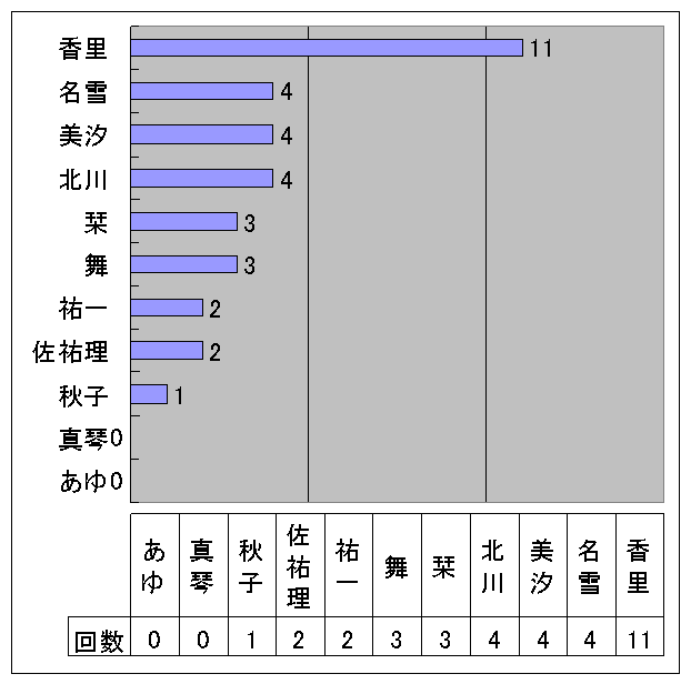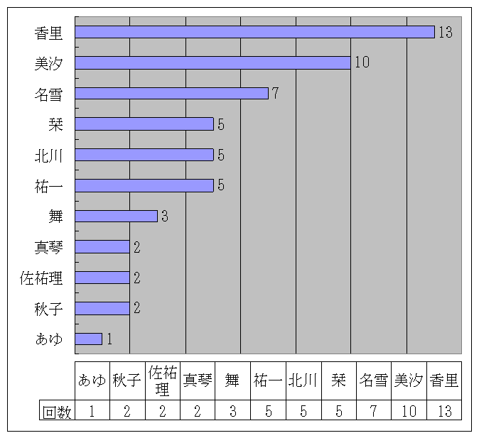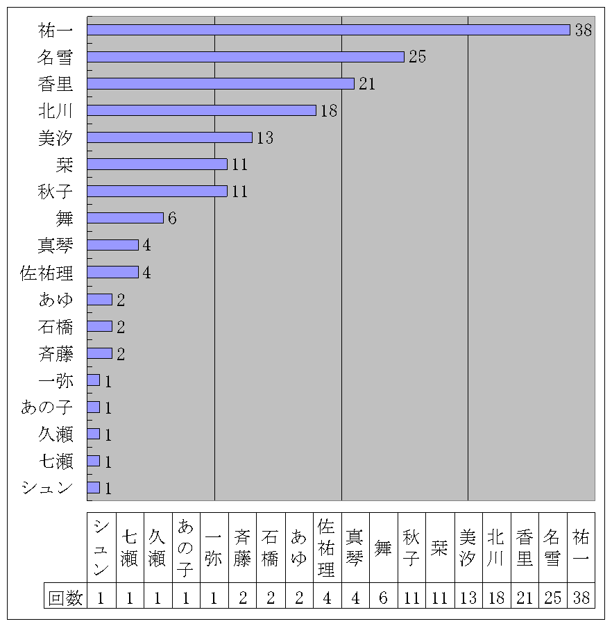 あと、この表には載っていない、ゲストの人。つまり、本編では名前すら登場しなかった人物が、あゆちゃんと同じ回数だけ登場しているの」